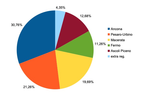 877 in provincia di Ancona,597 in provincia di Pesaro-Urbino,800 nella provincia di Macerata,353 nella provincia di Fermo,460 nella provincia di Ascoli Piceno,126 residenti fuori regione.