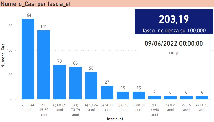 Dal bollettino quotidiano di oggi, 9 giugno 2022, del Ministero della Salute emergono i seguenti dati relativi all’Italia.Sono 23.042 i nuovi positivi nelle ultime 24 ore , per un totale di 17.589.595 da inizio pandemia.I tamponi effettuati nelle ultime 24 ore sono 179.127 complessivi ( test molecolari + test rapidi antigenici). L’incidenza del numero di persone risultate positive rispetto al numero giornaliero di tamponi effettuati è del 12,9% ( ieri 12%).