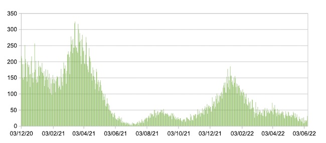 Sale rispetto a ieri il tasso di positività giornaliero; in questo periodo comunque si registrano valori più alti dello stesso rispetto allo scorso anno; il valore odierno ad esempio è 13 volte maggiore di quello del giorno 09/06/21.