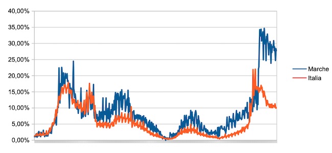 Il grafico seguente illustra l’andamento della percentuale giornaliera di nuovi casi positivi rispetto al corrispondente numero di tamponi (diagnostici +quelli di controllo) effettuati a livello nazionale e nella regione Marche nel periodo 1 settembre 2020 – 23 febbraio 2022.
