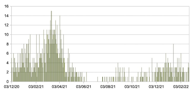 Il grafico seguente mostra i dati giornalieri relativi ai nuovi ingressi in terapia intensiva nelle Marche 3 dicembre 2020 – 23 febbraio 2022.