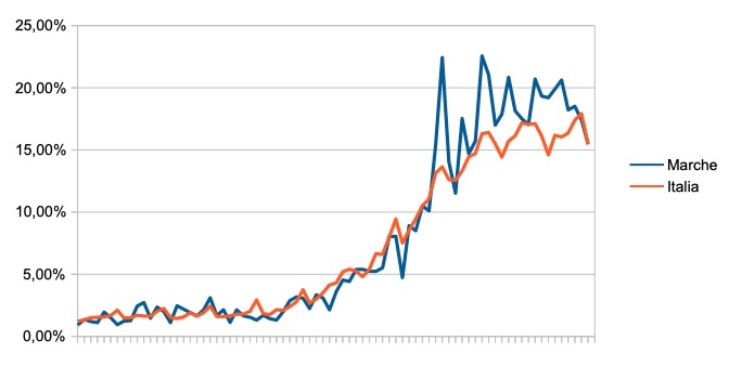 Il grafico seguente mostra l’andamento della percentuale giornaliera di nuovi casi positivi rispetto al corrispondente numero di tamponi (diagnostici +quelli di controllo) effettuati a livello nazionale e nella regione Marche nel periodo 1 settembre -17 novembre 2020.