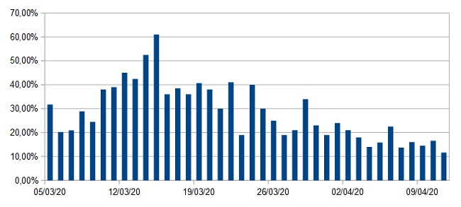 Il grafico sull’andamento dei contagi giornalieri nelle Marche nel periodo 4 marzo – 11 aprile 2020.