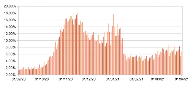 Il grafico mostra la percentuale di tamponi positivi giornalieri su tamponi giornalieri testati ( diagnostici+quelli di controllo) nel periodo 1 settembre 2020 –1 aprile 2021 in Italia.