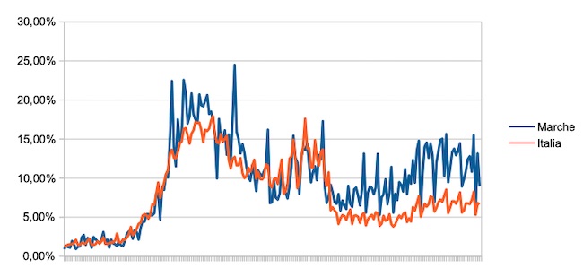 Il grafico seguente illustra l’andamento della percentuale giornaliera di nuovi casi positivi rispetto al corrispondente numero di tamponi (diagnostici +quelli di controllo) effettuati a livello nazionale e nella regione Marche nel periodo 1 settembre 2020 – 1 aprile 2021.