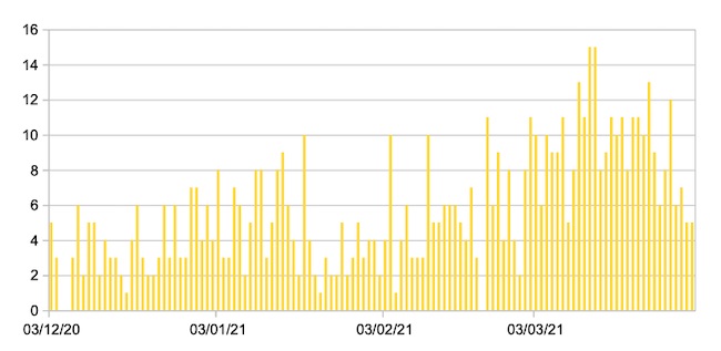 Il grafico seguente mostra i dati giornalieri relativi ai nuovi ingressi in terapia intensiva nelle Marche 3 dicembre 2020 – 1 aprile 2021.