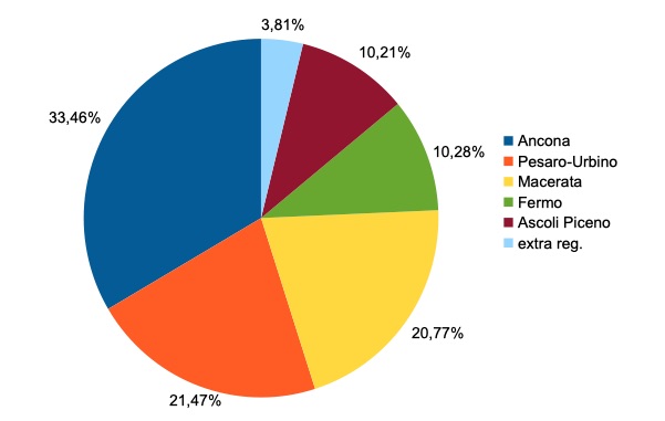 Del totale dei casi positivi 29.722 si riferiscono alla provincia di Ancona, 19.079 a quella di Pesaro-Urbino ,18.249 alla provincia di Macerata,9.142 a quella di Fermo, 9.069 a quella di Ascoli Piceno. Il servizio sanitario regionale delle Marche segue anche 3.372 casi fuori regione.