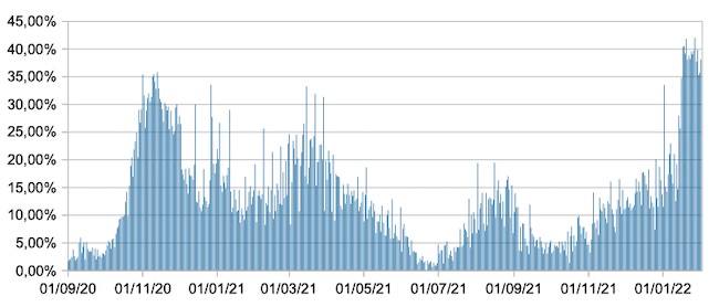 Il grafico mostra la percentuale di tamponi positivi giornalieri su tamponi giornalieri testati ( diagnostici+quelli di controllo) nel periodo 1 settembre 2020 – 1 febbraio 2022 in Italia.