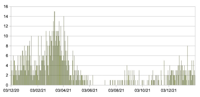 Il grafico seguente mostra i dati giornalieri relativi ai nuovi ingressi in terapia intensiva nelle Marche 3 dicembre 2020 – 1 febbraio 2022.