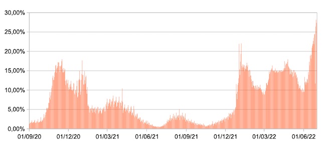 Scende rispetto a ieri il tasso di positività giornaliero; in questo periodo si registrano valori più alti dello stesso rispetto allo scorso anno; il valore odierno ad esempio è 54 volte maggiore di quello del giorno 01/07/21(era 0,5%).