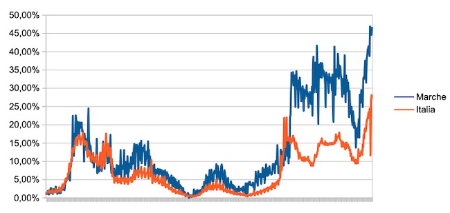 Sale rispetto a ieri il tasso di positività giornaliero nelle Marche.In questo periodo si registrano però valori più alti dello stesso rispetto allo scorso anno; il valore odierno ad esempio è 20 volte maggiore di quello del giorno 01/07/21( era 2,34%).