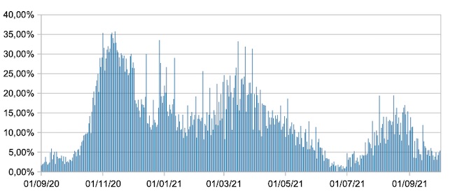 Il grafico mostra la percentuale di tamponi positivi giornalieri su tamponi giornalieri testati ( diagnostici+quelli di controllo) nel periodo 1 settembre 2020 –1 ottobre 2021 in Italia.