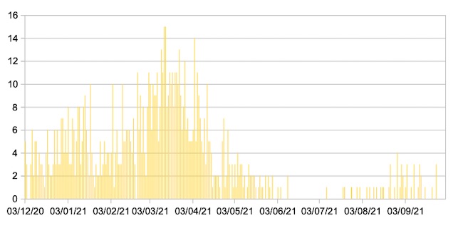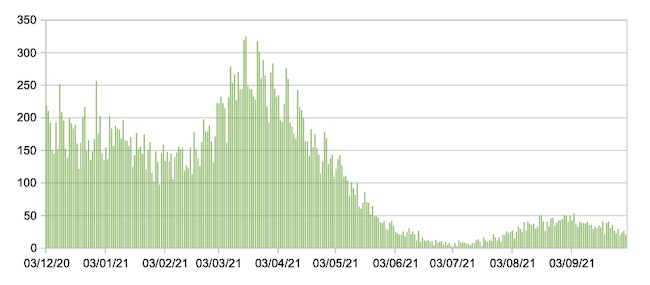 Il grafico seguente mostra i dati giornalieri relativi ai nuovi ingressi in terapia intensiva nelle Marche 3 dicembre 2020 – 1 ottobre 2021.