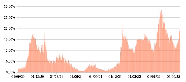 Il grafico mostra la percentuale di tamponi positivi giornalieri su tamponi giornalieri testati ( diagnostici+quelli di controllo) nel periodo 1 settembre 2020 – 1 ottobre 2022 in Italia.