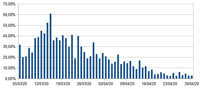 Continua il rallentamento della curva epidemiologica, infatti, dal 18 aprile gli incrementi giornalieri oscillano dal 2% al 6% segno che il contagio sta perdendo vigore. Altri segnali significativi vengono dal numero di dimessi/guariti che cresce di giorno in giorno e dal calo di terapie intensive e nuovi ricoveri.Siamo sulla strada giusta ,ma bisogna continuare a rispettare regole e restrizioni affinché si possano avere risultati sempre più confortanti.