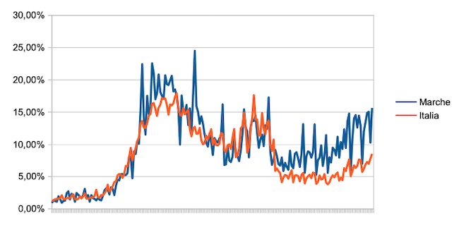 Il grafico seguente illustra l’andamento della percentuale giornaliera di nuovi casi positivi rispetto al corrispondente numero di tamponi (diagnostici +quelli di controllo) effettuati a livello nazionale e nella regione Marche nel periodo 1 settembre 2020 – 15 marzo 2021.