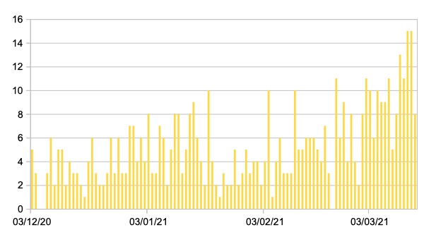 Il grafico seguente mostra i dati giornalieri relativi ai nuovi ingressi in terapia intensiva nelle Marche 3 dicembre 2020 – 15 marzo 2021