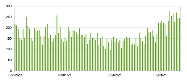 Il grafico seguente mostra i dati giornalieri ,a livello nazionale, relativi ai nuovi ingressi in terapia intensiva 3 dicembre 2020 – 15 marzo 2021