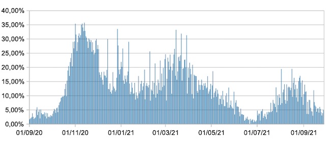 Il grafico mostra la percentuale di tamponi positivi giornalieri su tamponi giornalieri (nuove diagnosi) nel periodo 1 settembre 2020 – 27 settembre 2021 nelle Marche