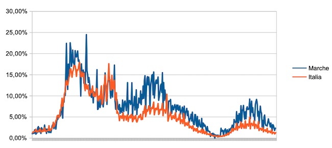 Il grafico seguente illustra l’andamento della percentuale giornaliera di nuovi casi positivi rispetto al corrispondente numero di tamponi (diagnostici +quelli di controllo) effettuati a livello nazionale e nella regione Marche nel periodo 1 settembre 2020 – 27 settembre 2021.