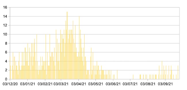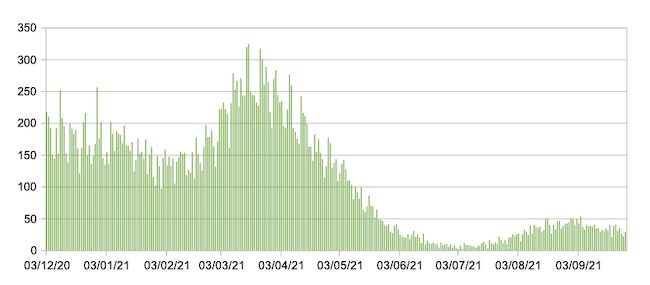 Il grafico seguente mostra i dati giornalieri relativi ai nuovi ingressi in terapia intensiva nelle Marche 3 dicembre 2020 – 27 settembre 2021.