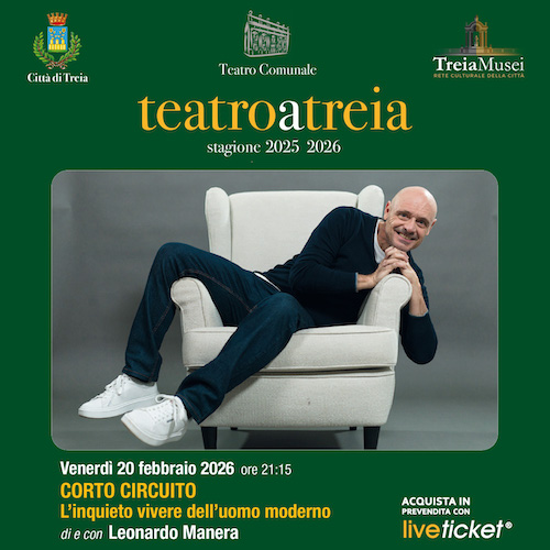 TREIA – Venerdì 20 febbraio 2026, alle ore 21.15, al Teatro Comunale di Treia andrà in scena “Corto circuito – L’inquieto vivere dell’uomo moderno” scritto e interpretato da Leonardo Manera. Lo spettacolo esplora con ironia le contraddizioni, i paradossi e le ansie della società contemporanea e attraverso la comicità mette a confronto l’etica e l’estetica nella vita di tutti i giorni. Leonardo Manera conferma la sua capacità di leggere i vizi e le virtù del tempo attuale e tra monologhi e personaggi contemporanei, prova a fare chiarezza, confrontandosi con la voce di un dio laico della modernità che lo induce continuamente in tentazione.
