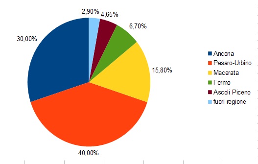Del totale dei casi positivi 1737 si riferiscono alla provincia di Ancona,2333 a quella di Pesaro-Urbino ,la più colpita, 922 alla provincia di Macerata,391 a quella di Fermo,271 a quella di Ascoli Piceno .Il servizio sanitario regionale delle Marche segue anche 172 casi fuori regione.