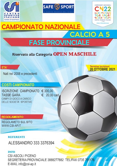 ASCOLI PICENO – Sono ufficialmente aperte le iscrizioni al campionato open di calcio a 5 del Centro Sportivo Italiano del comitato provinciale di Ascoli Piceno, presieduto da Antonio Benigni.