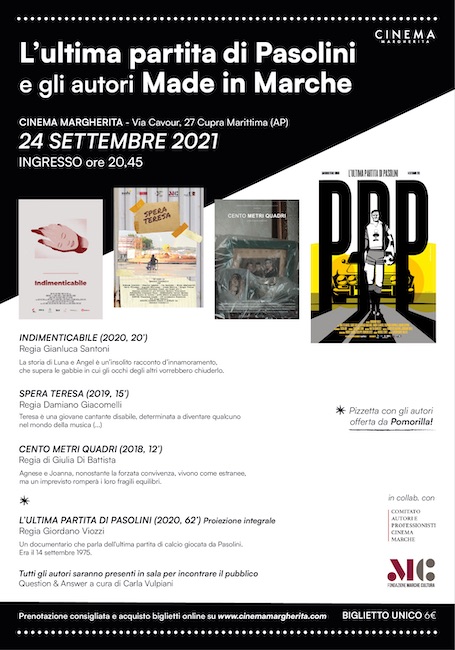 CUPRA MARITTIMA (AP) – Quarantasei anni fa veniva barbaramente ucciso Pier Paolo Pasolini e quarantesei anni fa il 14 settembre 1975, qualche settimana prima di morire quindi, il poeta era a San Benedetto per giocare una partita di calcio. Giordano Viozzi ha raccontato questo momento nel docu-film ‘L’ultima partita di Pasolini’, un lavoro che ha richiesto 5 anni di lavorazione le cui ricerche sono a cura di Francesco M. Anzivino. Il film è stato acquistato da una piattaforma on demand nazionale, ma venerdì 24 settembre sarà possibile vederlo sul grande schermo del Cinema Margherita. Costituirà la prima visione cinematografica pubblica nella sua versione integrale, momento particolarmente atteso dove sarà possibile parlare con l’autore e riflettere insieme su un momento cruciale della nostra storia e su un intellettuale tra i più importanti del 900, che ha amato moltissimo il calcio.La serata nasce da una collaborazione tra il “Comitato autori professionisti delle Marche” e il cinema Margherita e la Fondazione Marche Cultura. Nella prima parte della serata saranno proiettati anche i corti: Indimenticabile di Gianluca Santoni, insignito da pochi giorni del premio Sonego a Venezia 78’; Spera Teresa di Damiano Giacomelli, miglior cortometraggio al Torino Film Festival 2019; Cento metri quadri di Giulia Di Battista, premio Cinema d’Autrice.Sono tutti corti di autori nati e cresciuti nelle Marche, che si sono distinti a livello nazionale per la qualità delle loro opere, alcune delle quali ambientate nel nostro territorio. I registi dialogheranno con Carla Vulpiani, esperta di corti internazionali. Il cinema Margherita ha voluto fortemente questa serata: un momento per rafforzare lo sguardo sul nostro territorio, di cui condividiamo le radici. Una opportunità ed una ricchezza che non possiamo perdere per crescere cercando di acquisire consapevolezza di chi siamo, ma anche sostenere il nostro patrimonio intellettuale.