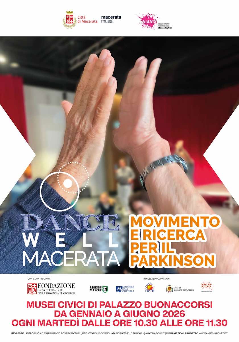 MACERATA – Da domani, martedì 27 gennaio e fino a giugno Macerata accoglie “Dance Well – Movimento e ricerca per il Parkinson”, progetto per promuovere la pratica della danza contemporanea in spazi museali e contesti artistici a beneficio dei malati di Parkinson e delle persone con ridotte capacità motorie. L’iniziativa si svolge a Palazzo Buonaccorsi promossa dal Comune di Macerata e dall’AMAT, grazie al prezioso contributo della Fondazione Cassa di Risparmio della Provincia di Macerata, in collaborazione con Regione Marche, MiC, Associazione Parkinson Marche, Musei Civici di Macerata.