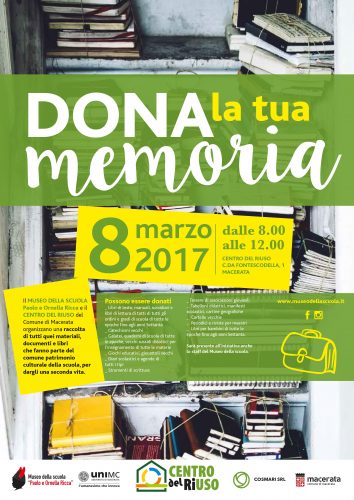 Per donare i materiali basta portarli al Centro del Riuso del comune di Macerata, partner del Museo Ricca nel progetto, dalle ore 8 alle ore 12 dell’8 marzo. Tutto ciò che sarà donato entrerà a far parte dell’Archivio Museale e i donatori saranno iscritti all’Albo dei Donatori e diventeranno Volontari della Memoria della Scuola.