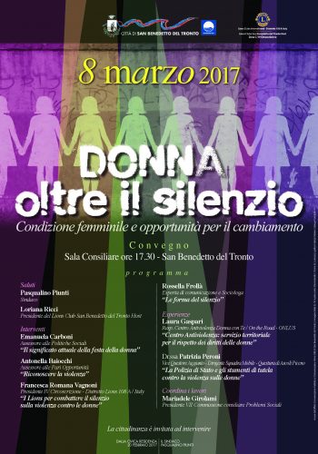 A organizzare l’evento sono l’amministrazione comunale di San Benedetto e il Lions Club San Benedetto del Tronto Host; si parlerà di violenza ma anche di solidarietà tra donne, ad essere approfondite saranno le realtà attuali della donna, anche attraverso delle testimonianze, per capire dove e come cambiare il nostro essere, il tutto per rafforzare ancora di più il ruolo della donna nella nostra società moderna, ruolo avente pari dignità rispetto a quello maschile.