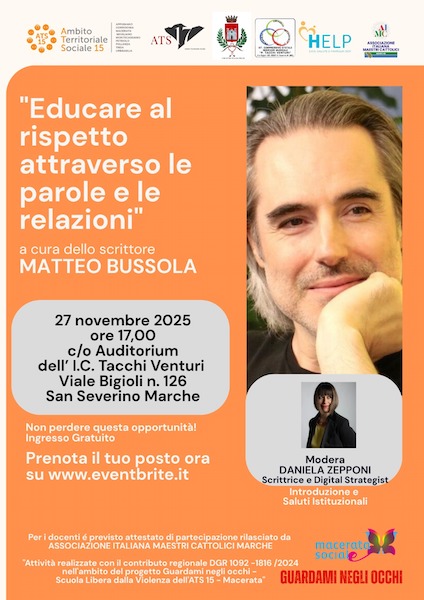 L’Ambito Territoriale Sociale 15 (ATS 15) è lieto di annunciare un importante appuntamento formativo e culturale con lo scrittore e autore di successo Matteo Bussola. L’incontro, dal titolo “Educare al rispetto attraverso le parole e le relazioni”, si terrà il prossimo 27 novembre 2025, alle ore 17:00, presso l’Auditorium dell’I.C. Tacchi Venturi (Viale Bigioli n. 126, San Severino Marche).