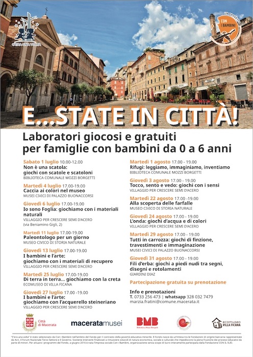 MACERATA – Al via dal 1° luglio 13 appuntamenti che si svolgeranno nei giardini dei nidi comunali, e in alcuni luoghi pubblici della città, con l’obiettivo di favorire l’accesso ai servizi alle famiglie che non li frequentano e ampliare allo stesso tempo l’offerta educativa “E… state in città!”, ovvero laboratori giocosi e gratuiti per famiglie e bambini 0 – 6 anni è il titolo della nuova iniziativa del Comune di Macerata organizzata nell’ambito del progetto “C’era una volta” selezionato da Con i Bambini nell’ambito del Fondo per il contrasto della povertà educativa minorile – CUP I89I2200071000. Il progetto triennale vuole ampliare l’accesso ai servizi per minori 0-3 del territorio e costruire un modello integrato di educazione e cura della prima infanzia, coinvolgendo una vasta rete di soggetti: realtà del terzo settore ed enti pubblici delle Marche, tra cui il Comune di Macerata; capofila di “C’era una volta” è Labirinto cooperativa sociale di Pesaro.