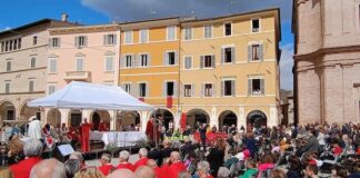 SAN SEVERINO MARCHE - Piazza Del Popolo, luogo simbolo della Città di San Severino Marche, gremita di fedeli oggi,...