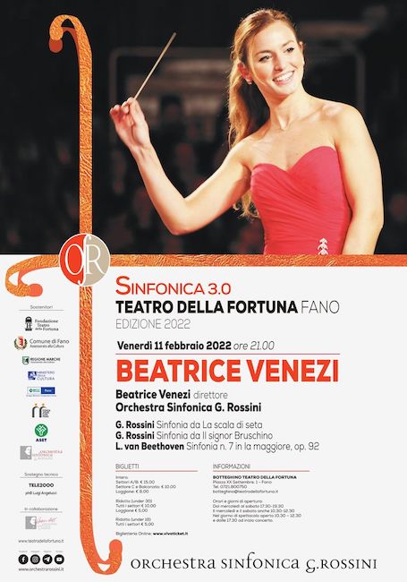 FANO – Un concerto tra opera lirica e repertorio sinfonico, da Rossini a Beethoven, che vedrà salire sul podio dell’Orchestra Sinfonica G. Rossini la direttrice d’orchestra, ormai notissima al grande pubblico, Beatrice Venezi. Il secondo appuntamento con Sinfonica 3.0 al Teatro della Fortuna di Fano è per venerdì 11 febbraio, alle 21.00.