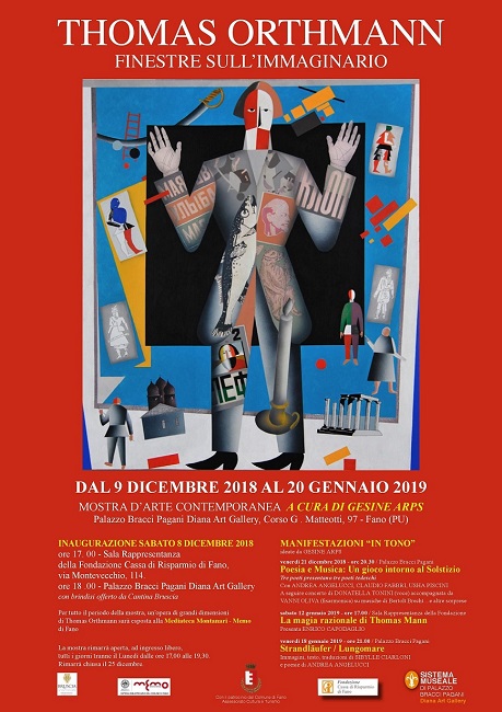 FANO – Sarà inaugurata sabato 8 dicembre alle ore 17.00 nella Sala di Rappresentanza della Fondazione Cassa di Risparmio di Fano ,in Via Montevecchio, 114 e a seguire alle ore 18.00 a Palazzo Bracci Pagani, la mostra“Finestre sull’immaginario”,una retrospettiva di grande pregio dedicata all’immaginario di Thomas Orthmann.