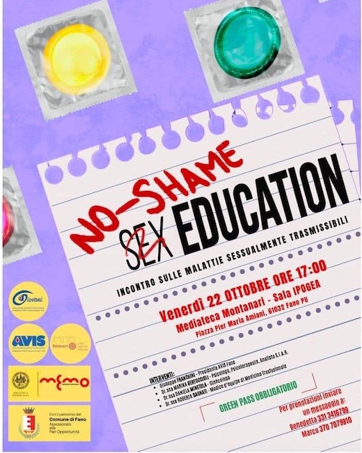 FANO (PU) – Il gruppo giovani di Avis Fano organizza un seminario sulle Malattie Sessualmente Trasmissibili dal titolo significativo “No-Shame Sex Education”, che si terrà venerdì 22 ottobre 2021 alle ore 17.00 presso la Sala Ipogea della Mediateca Montanari – Memo.