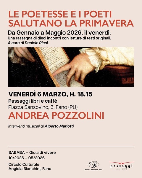 Marzo è il mese della poesia e sono ben quattro gli appuntamenti dedicati. Venerdì 6 e venerdì 27 marzo (ore 18.15) saranno ospiti i poeti Andrea Pozzolini e Francesco Gabellini, all’interno della bella rassegna del Circolo Culturale Bianchini “Le poetesse e i poeti salutano la primavera”, curata da Daniele Ricci.