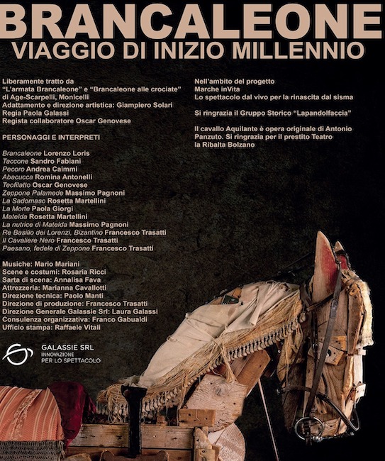 Non si ferma mai Brancaleone. Ha sempre nuove sfide da compiere. Il suo incedere può sembrare lento, a volte confusionario, ma in realtà sa esattamente dove vuole andare e perché: ha una missione, è mosso dal bene. Il suo viaggio, iniziato in piena pandemia, ha toccato i comuni del cratere, colpiti dal sisma 2016. Una luce accesa nelle piazze, un momento di leggerezza con la compagnia diretta da Giampiero Solari.