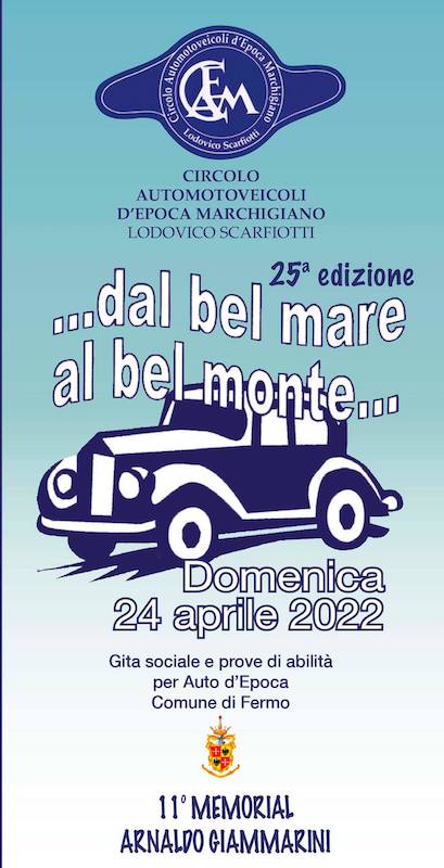 FERMO – Si avvicina il terzo evento stagionale del Circolo Automotoveicoli d’Epoca Marchigiano/Lodovico Scarfiotti. Si tratta di “Dal bel mare al bel monte-11° Memorial Arnaldo Giammarini” con la sua 25^ edizione per auto storiche in programma per domenica prossima 24 aprile.