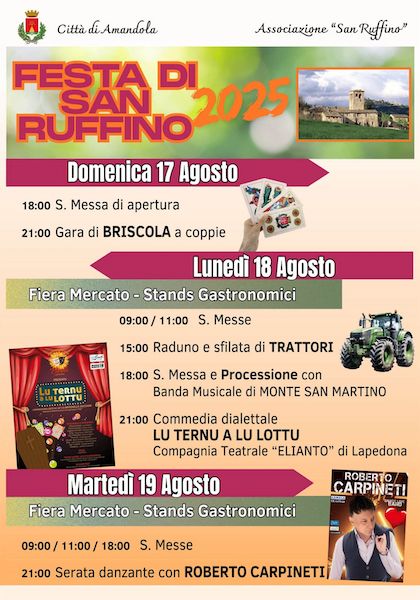 La Festa organizzata dalla locale “Associazione San Ruffino” con la partecipazione del Comune di Amandola e della Pro Loco di Amandola, si svolge quest’anno in tre giorni: 17, 18, 19 agosto.