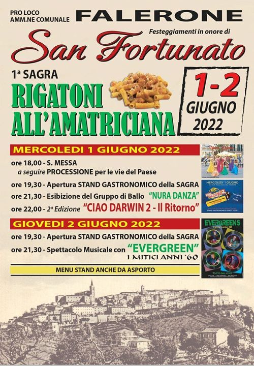 Proprio a Falerone, mercoledì primo Giugno 2022, sacro e profano si mescolano nei festeggiamenti in onore di San Fortunato, patrono del paese.