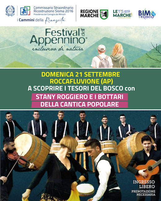 ASCOLI PICENO – Appuntamento con il Festival dell’Appennino, inclusivo di natura domenica 21 settembre a Roccafluvione (AP) con una suggestiva escursione per poi spostarci nel mirtilleto dell’azienda agricola Tesori del Bosco dove si svolgerà il resto della giornata con pranzo,circoludobus e concerto di Stany Roggiero e i Bottari della Cantica Popolare.