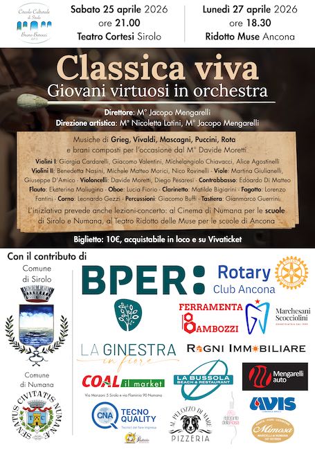 La Prima edizione del Festival “Classica viva. Giovani virtuosi in orchestra” si terrà sabato 25 e lunedì 27 aprile 2026. In programma due concerti con orchestra di giovani musicisti e musiciste al Teatro Cortesi di Sirolo e al Ridotto delle Muse di Ancona