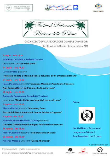 SAN BENEDETTO DEL TRONTO – Parte la seconda edizione del Festival Letterario Riviera delle Palme organizzato dalla Omnibus Omnes, con il Patrocinio del Comune di San Benedetto del Tronto. Si riconferma la location della scorsa edizione, lo Chalet Kontiki, valida anche in caso di pioggia.