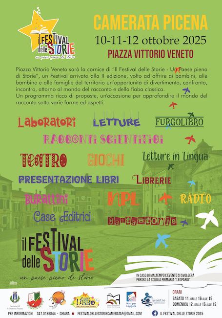 Dal 10 al 12 ottobre in piazza Vittorio Veneto a Camerata Picena, si terrà il “Festival delle storie-un paese pieno di storie” tra laboratori creativi, incontri, letture, spettacoli e giochi che coinvolgeranno bambini, famiglie e artisti