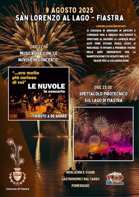 Alle ore 22:00 sarà la volta del complesso “Le Nuvole in concerto – tributo a De Andrè” che anticiperà lo spettacolo pirotecnico e riprenderà a conclusione dello stesso. L’amministrazione comunale ha predisposto nuove aree parcheggio, accanto a quelle storiche, per evitare congestioni durante l’arrivo e il deflusso dei visitatori. L’invito a coloro che parteciperanno è ad arrivare in giornata, evitando di concentrare gli arrivi negli ultimi minuti precedenti lo spettacolo pirotecnico, anche per godersi al meglio il territorio, rilassarsi sulle spiagge attrezzate o fare una passeggiata al Sentiero per Tutti, lungo il lago.