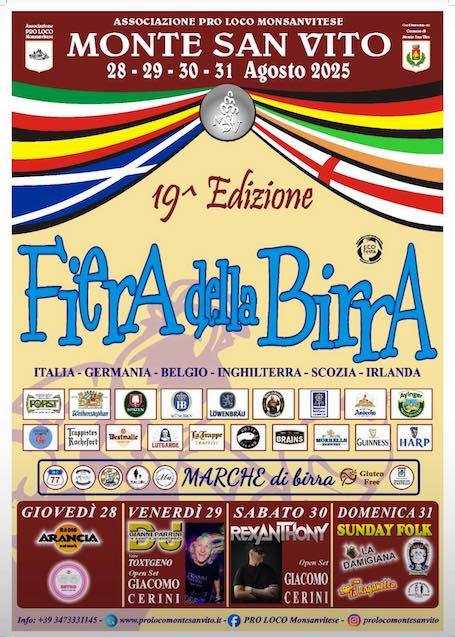 MONTE SAN VITO (AN) – Da giovedì 28 a domenica 31 agosto 2025 in centro storico a Monte San Vito, la Pro Loco monsanvitese con il patrocinio del Comune di Monte San Vito, organizza la Fiera della Birra, che quest’anno si preannuncia davvero unica nel suo genere con tantissime novità.