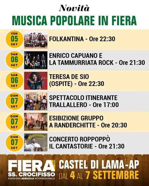 CASTEL DI LAMA (AP) – Il programma musicale della Fiera del Santissimo Crocifisso a Piattoni di Castel di Lama si prepara a regalare emozioni forti con un cartellone ricco di artisti e gruppi folk. Tra le novità più attese c’è la partecipazione straordinaria della cantautrice Teresa De Sio, pronta a calcare il palco sabato 6 settembre alle 22.30.